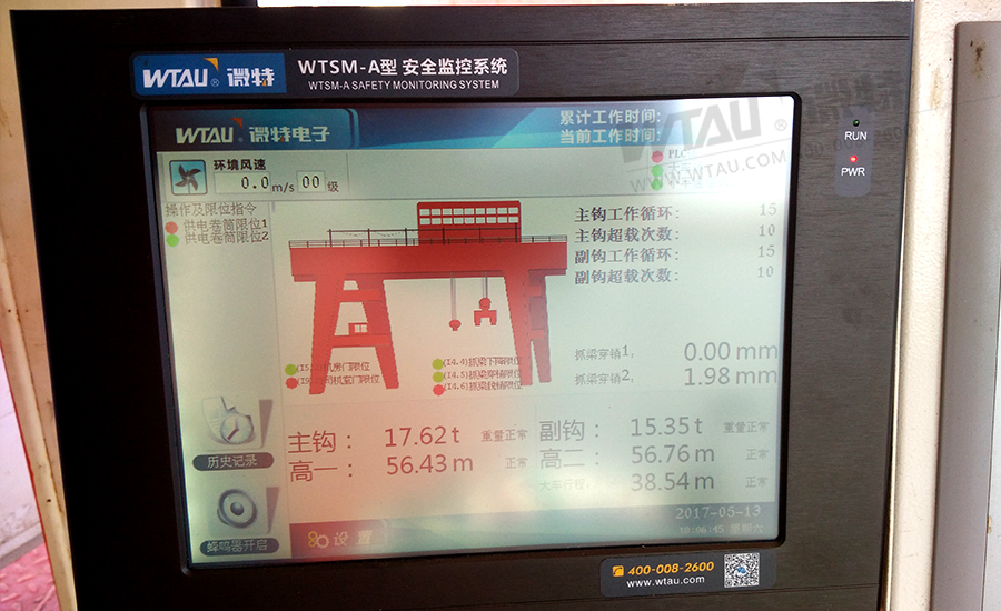 微特安全監(jiān)控系統(tǒng),對(duì)門機(jī)運(yùn)行工況進(jìn)行實(shí)時(shí)采集,實(shí)時(shí)記錄。進(jìn)行數(shù)據(jù)核算比對(duì),顯示畫面比傳統(tǒng)儀表更直觀、更友好。在門機(jī)運(yùn)行接近限定值、規(guī)定值,系統(tǒng)將對(duì)司機(jī)做出提醒,在到達(dá)限定值時(shí)將警告司機(jī),并停止司機(jī)的危險(xiǎn)操作。