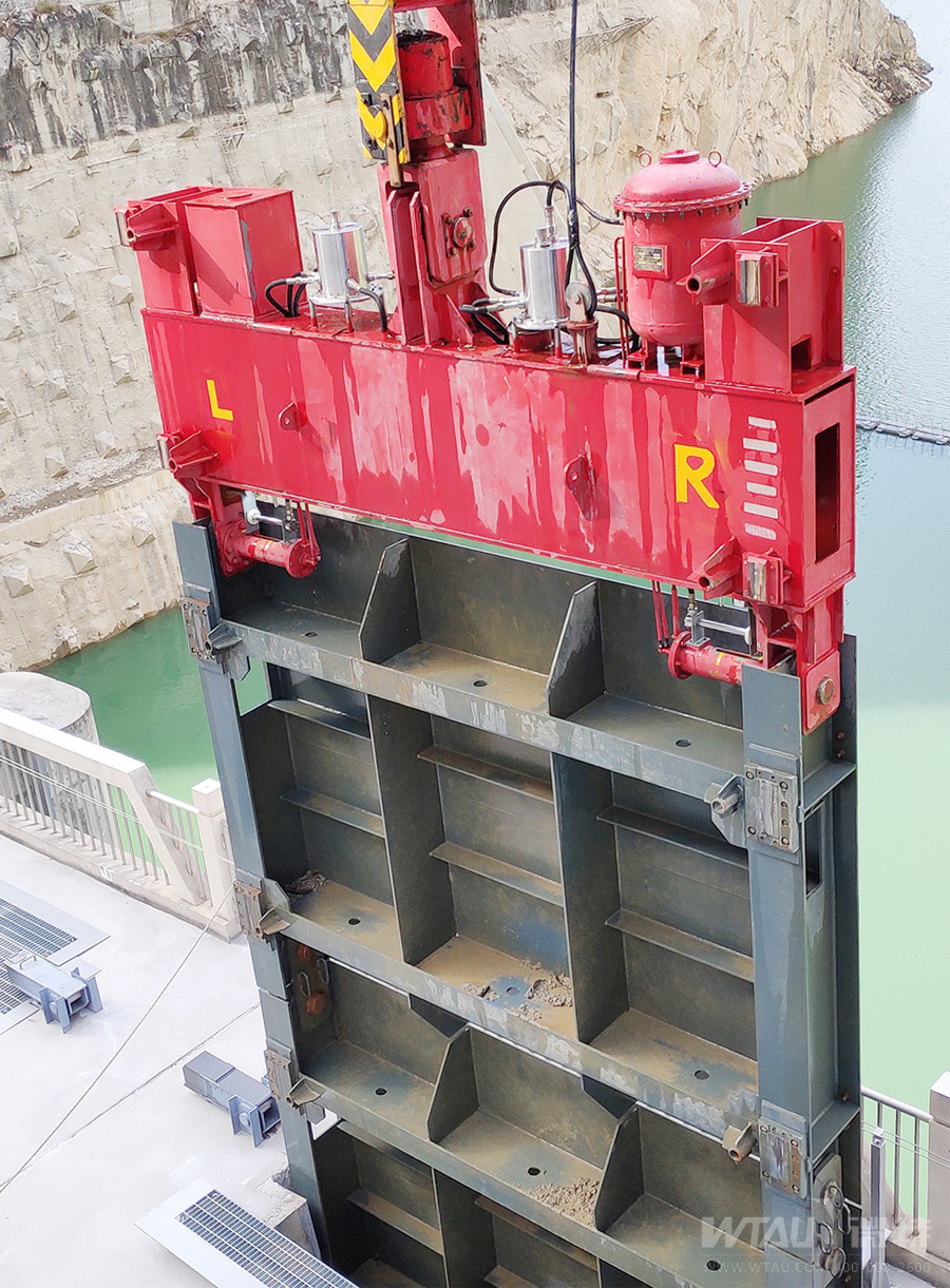 這次改造的進水口兩臺3200kN/650kN門機,主鉤用于提落機組檢修門,回轉(zhuǎn)吊用于提落攔污柵、疊梁門。由于每年需要進行一次攔污柵清理,兩次疊梁門提落,回轉(zhuǎn)吊使用頻率高?;剞D(zhuǎn)吊水下抓梁工作深度較深,使用過程中無法直接獲取水下抓梁就位及穿脫銷情況,水下存在異物時操作風險較大。