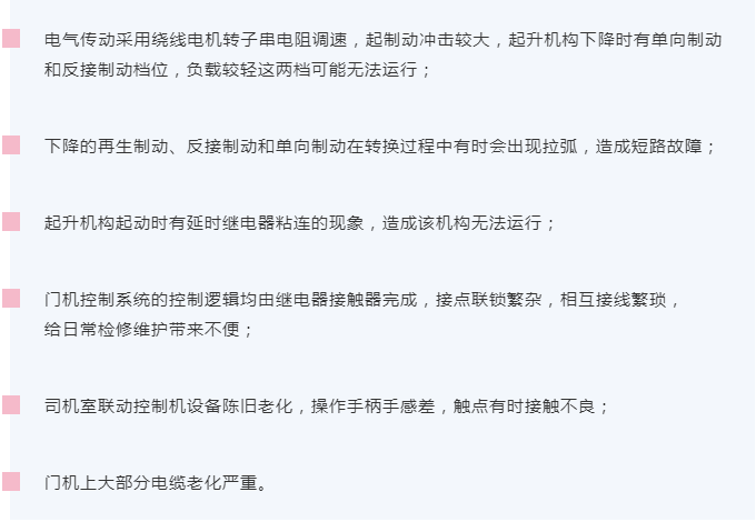 金銀臺(tái)樞紐1250T雙向門機(jī)電氣控制系統(tǒng)于2012年投運(yùn)至今已有8年,控制系統(tǒng)元器件老化,部分元器件已停產(chǎn),無法提供備件,控制線路老化,可靠性降低,影響設(shè)備安全運(yùn)行,無法滿足設(shè)備安全生產(chǎn)的需要。原控制系統(tǒng)設(shè)計(jì)性能差,操作系統(tǒng)容易出故障,啟動(dòng)沖擊較大,平穩(wěn)性差。據(jù)現(xiàn)場調(diào)研主要存在以下問題:
