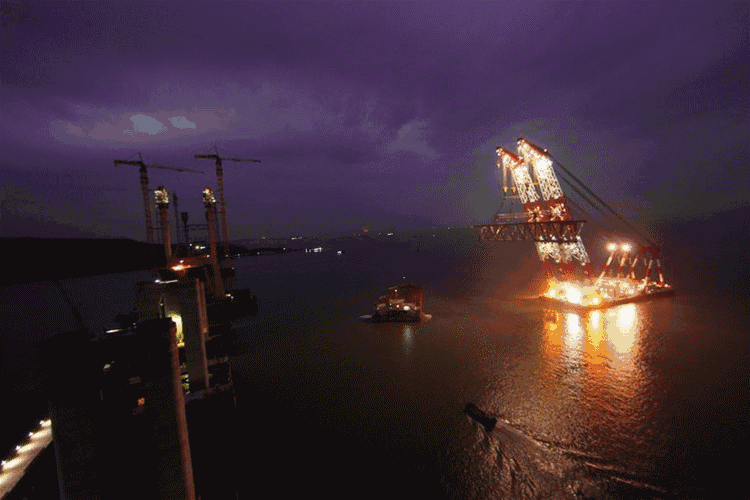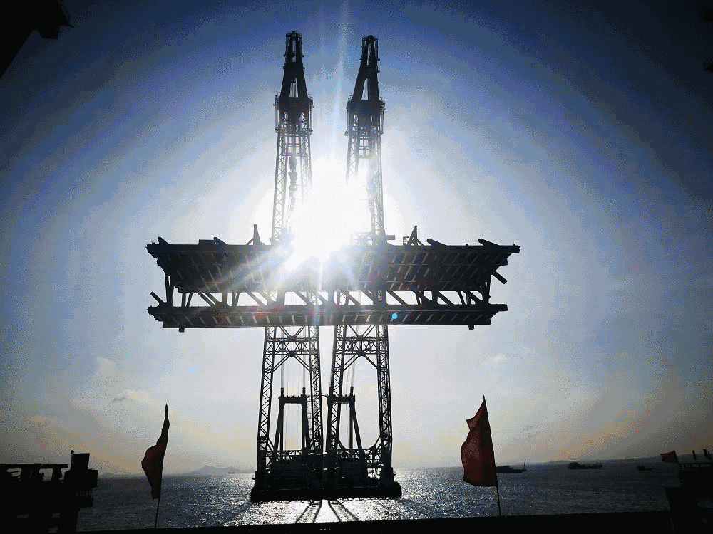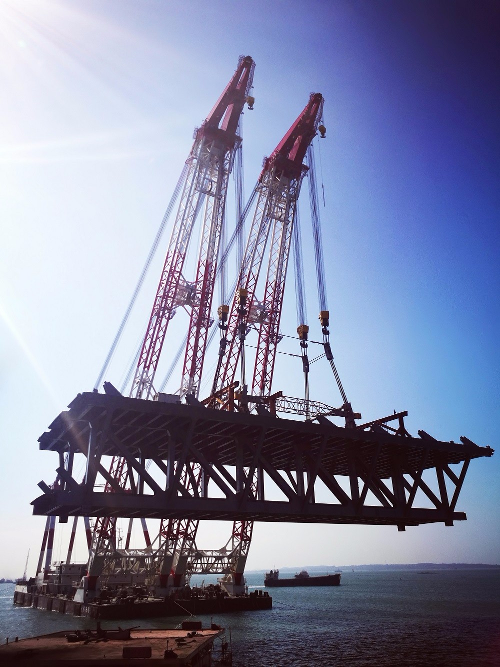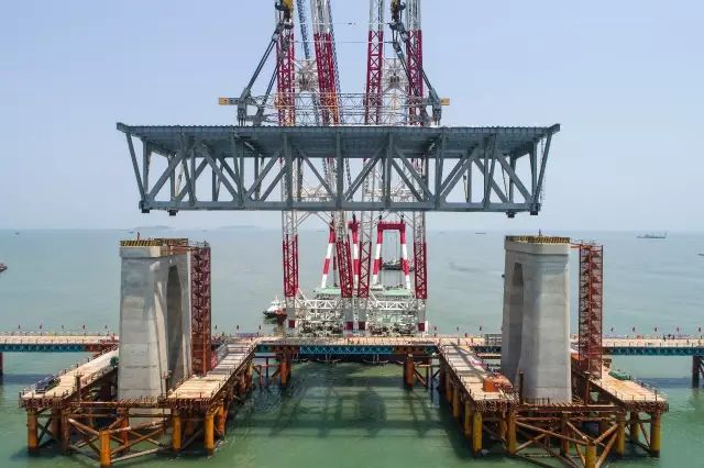 為克服惡劣自然環(huán)境,大橋施工采取鋼桁梁整孔全焊接制造,在工廠整體制造總拼,然后裝船從江蘇如皋歷經(jīng)約1000公里海上運輸至橋位處,現(xiàn)場海上浮吊整孔架設(shè),為國內(nèi)首創(chuàng),填補了我國斜拉橋大節(jié)段鋼桁梁整孔吊裝架設(shè)的技術(shù)空白。本次吊裝的超級鋼桁梁長96.25米,寬36.8米,相當(dāng)于8個籃球場;高15.35米,相當(dāng)于5層樓;設(shè)計重量達(dá)3150噸,加上吊具起吊重量近3400噸,相當(dāng)于2260輛小汽車的重量。