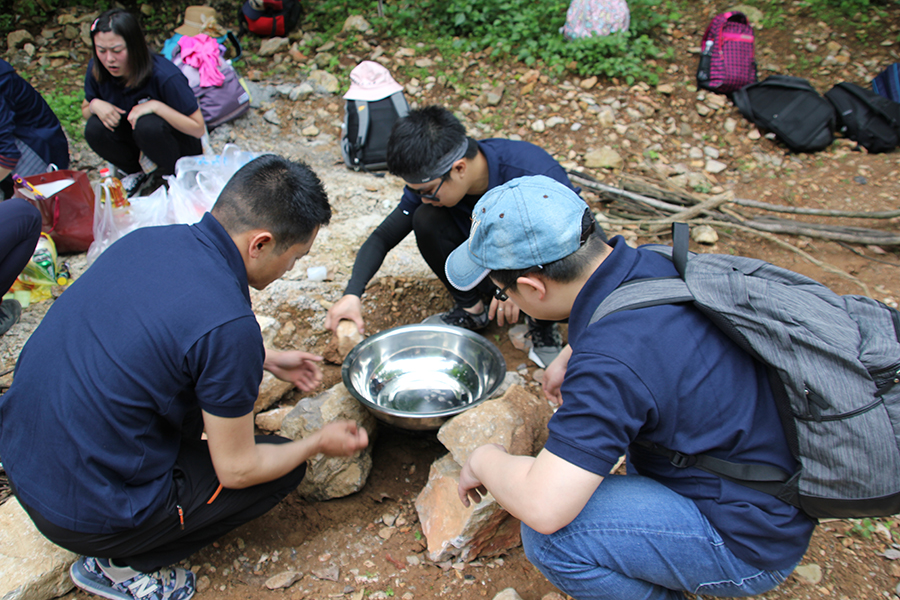 經(jīng)過(guò)半天的登山式行軍,中午,我們來(lái)到山谷中一處較平坦地地方,各隊(duì)開(kāi)始分工埋鍋造飯,相互配合做中餐。