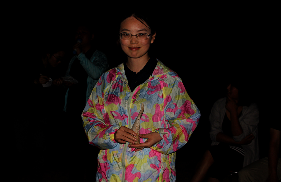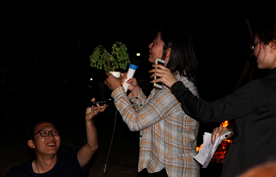 晚會(huì)最后,各隊(duì)拿出各自行軍過(guò)程中尋得的寶物,在這里微特公司首次愛(ài)心拍賣(mài)會(huì)溫情上演。(上圖為Supreme隊(duì)持寶人正在講解她所持的盆栽寶貝,左右兩邊的隊(duì)員正在為寶貝打燈光)