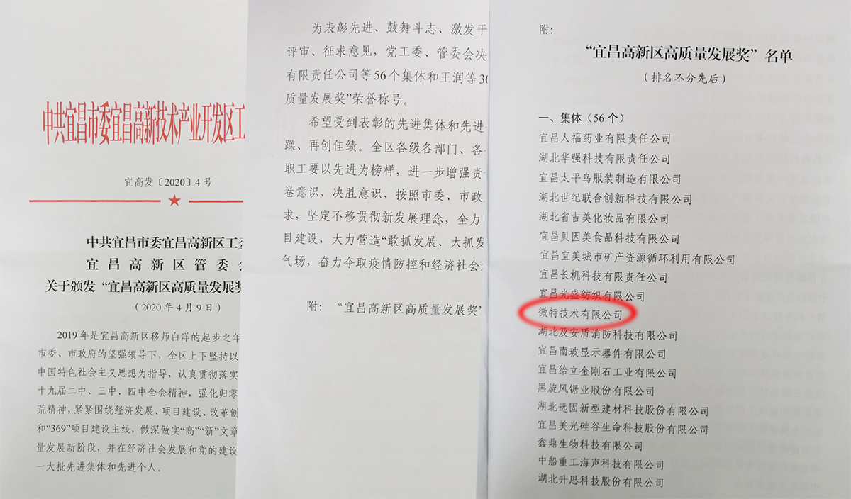 近日,微特技術有限公司榮獲由宜昌高新區(qū)黨工委、管委會授予的2019年度宜昌高新區(qū)“高質(zhì)量發(fā)展獎”。