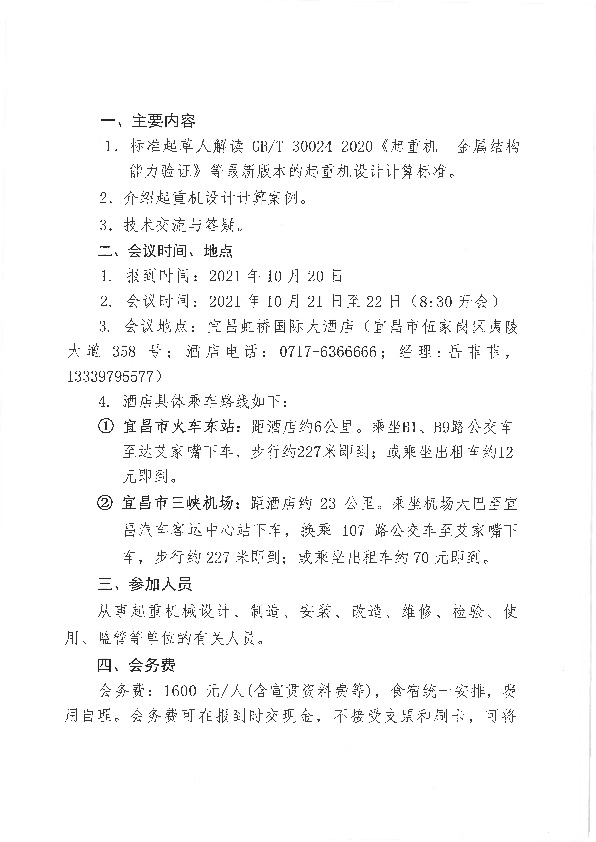 原定于2021年8月18日至19日在宜昌召開的全國起重機械標準化技術委員會組織的關于GB/T 30024-2020《起重機 金屬結構能力驗證》等起重機設計標準宣貫會,由于疫情原因進行了延期。經組委會研究決定將于2021年10月20日至22日仍在宜昌召開此次會議。