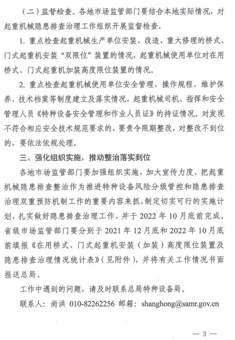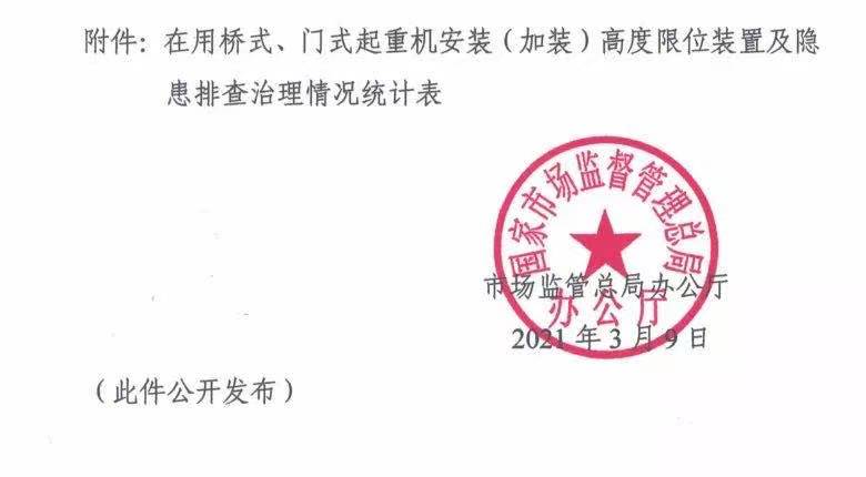 為“消除事故隱患,筑牢安全防線”,國家市場監(jiān)督管理總局辦公廳于3月9日發(fā)布《關(guān)于開展起重機(jī)械隱患排查治理工作的通知》。