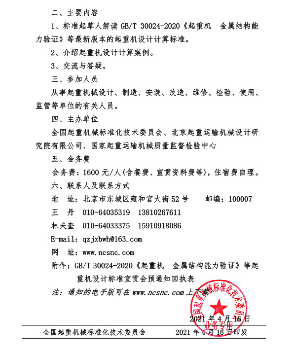 此次宣貫會(huì)主要圍繞標(biāo)準(zhǔn)起草人解讀 GB/T 30024-2020《起重機(jī) 金屬結(jié)構(gòu)能 力驗(yàn)證》等最新版本的起重機(jī)設(shè)計(jì)計(jì)算標(biāo)準(zhǔn),介紹起重機(jī)設(shè)計(jì)計(jì)算案例以及交流與答疑三個(gè)部分開展。凡從事起重機(jī)械設(shè)計(jì)、制造、安裝、改造、維修、檢驗(yàn)、使用、 監(jiān)管等單位的有關(guān)人員均可參會(huì)。