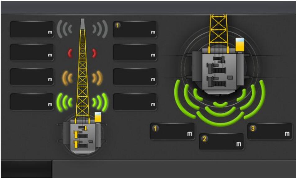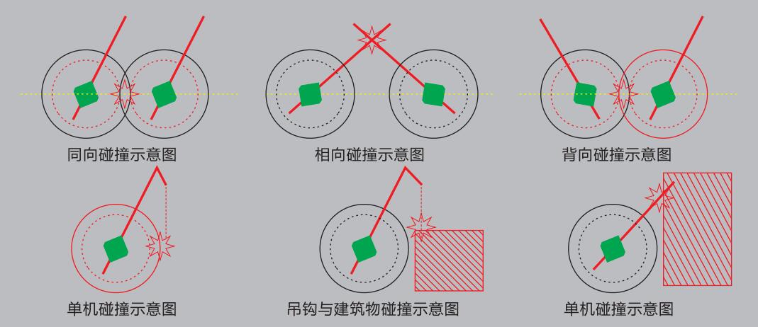 區(qū)域主動防碰撞系統(tǒng): 通過雷達(dá)主動監(jiān)測起重機(jī)易碰運(yùn)動部位路徑,探測區(qū)域空間內(nèi)是否有障礙物,以此來避免吊機(jī)與吊機(jī)間,回轉(zhuǎn)部位與其它物體、臂架與周邊物體之間的區(qū)域空間是否安全,在安全區(qū)被入侵時發(fā)出聲、光報警,甚至給出止??刂菩盘?,實(shí)現(xiàn)主動防碰撞監(jiān)測保障設(shè)備安全。