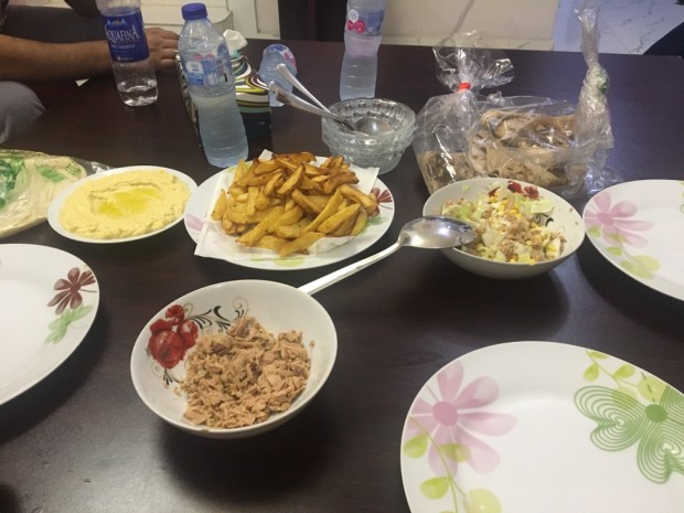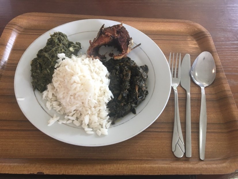 在尼日尼亞的第一餐,因?yàn)轲I了,所以吃到一半才記起拍個(gè)照片,對面的同事很厲害,已快速解決了。味道“國內(nèi)的東西還是好吃些”