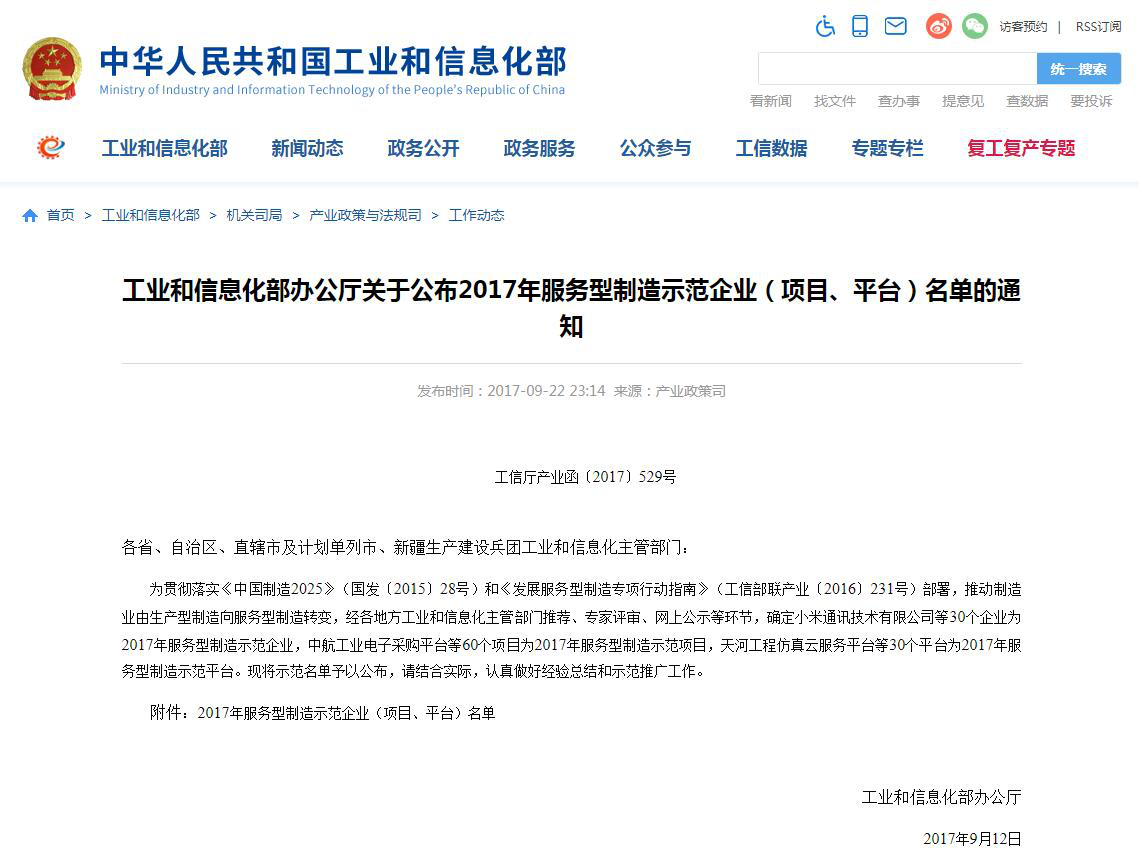2017年9月22日,中華人民共和國工業(yè)和信息化部網(wǎng)站發(fā)布工信廳產(chǎn)業(yè)函〔2017〕529號文件《工業(yè)和信息化部辦公廳關(guān)于公布2017年服務(wù)型制造示范企業(yè)(項目、平臺)名單的通知》。