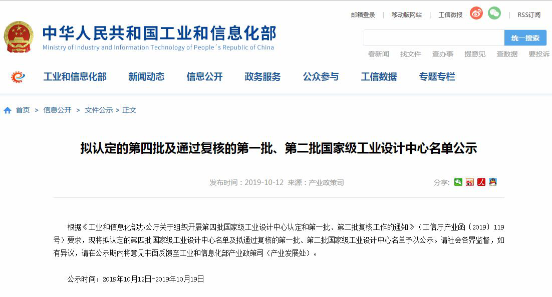 2019年,10月12日,中華人民共和國工業(yè)和信息化部網(wǎng)站發(fā)布《擬認定的第四批及通過復(fù)核的第一批、第二批國家級工業(yè)設(shè)計中心名單公示》信息,微特技術(shù)有限公司被認定為第四批國家級工業(yè)設(shè)計企業(yè)。