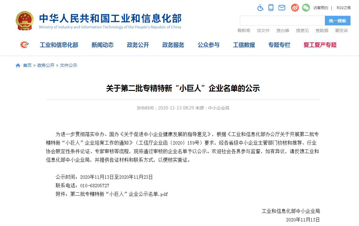 2020年11月13日,中華人民共和國工業(yè)和信息化部網(wǎng)站發(fā)布《關(guān)于第二批專精特新“小巨人”企業(yè)名單的公示》,微特入選第二批專精特新“小巨人”企業(yè)。